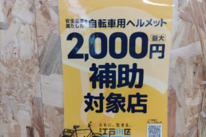 お問合せ下さった皆さま、お待たせしました! 令和5年7月より始まった 自転車用ヘルメット購入時、江戸川区が2000円助成してくれる制度ですが、 令和5年10月より、当店も補助対象店舗になります! 購入補助事 …